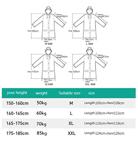 Volledig compatibel met uniseks volwassenen: een maat voor mannen en vrouwen (M, L, XL, XXL 4 maten om uit te kiezen). De regenponcho kan gemakkelijk worden gedragen en opgenomen. Gemakkelijk te reinigen, in geval van vlekken, reinig het met een vochtige doek en leg het op een goed geventileerde plaats.